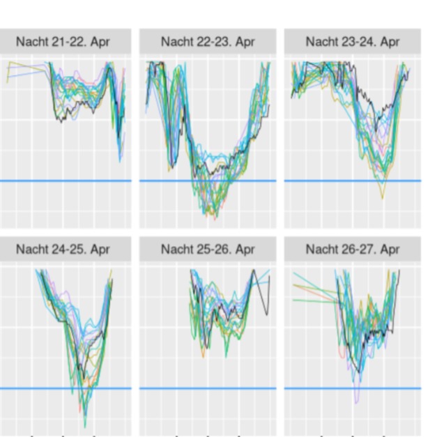 - Der stärkste Temperaturabfall in der Beispielgrafik trat in der Nacht vom 24. auf den 25. April auf, was auf ein signifikantes Frostereignis hindeutet.